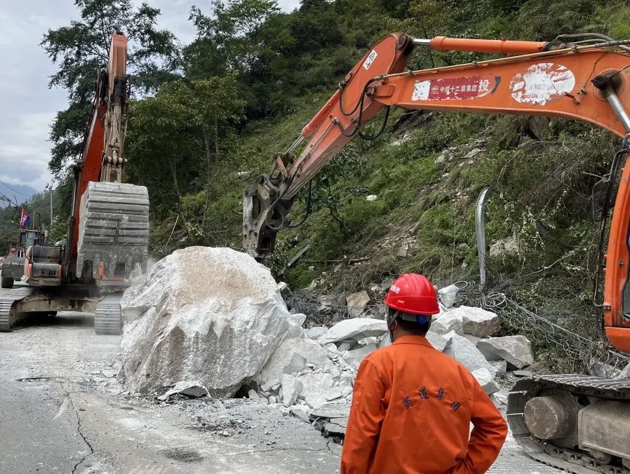 9 月 6 日,王海燕拿着对讲机调动人员、设备前往省道 S434 金光村至磨西镇段,突击队在乱石嶙峋的道路上颠簸了一个多小时后,他们被一块巨石挡住了去路,这块从山上飞落的巨石,深陷入地1.5 米左右、足足 600 余吨,要打通这条道路,必须“啃掉”这只拦路虎。王海燕和团队根据现场情况,最终确定利用破碎式挖掘机将巨石“啃碎”的处置方案,确定方案后王海燕一边招呼着车辆靠边临停,一边以巨石为中心,在左右各100米的路段中来回快走,不停地判断塌方山体危险点位,几分钟后,他设置好6个安全岗哨,便开始了抢通工作。虽然王海燕和挖掘机操作手配合默契,但巨石破碎过程却异常缓慢,经过突击队4个小时的努力,终于啃下这块巨大的“硬骨头”,成功完成了得妥镇金光村至磨西镇段抗震救援通道抢通保畅工作。