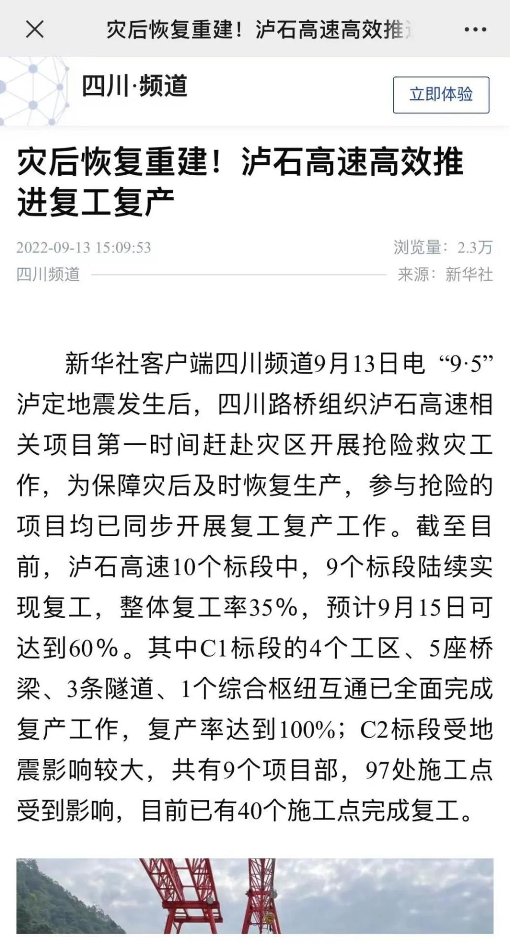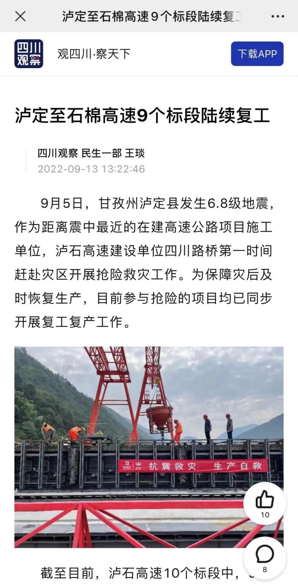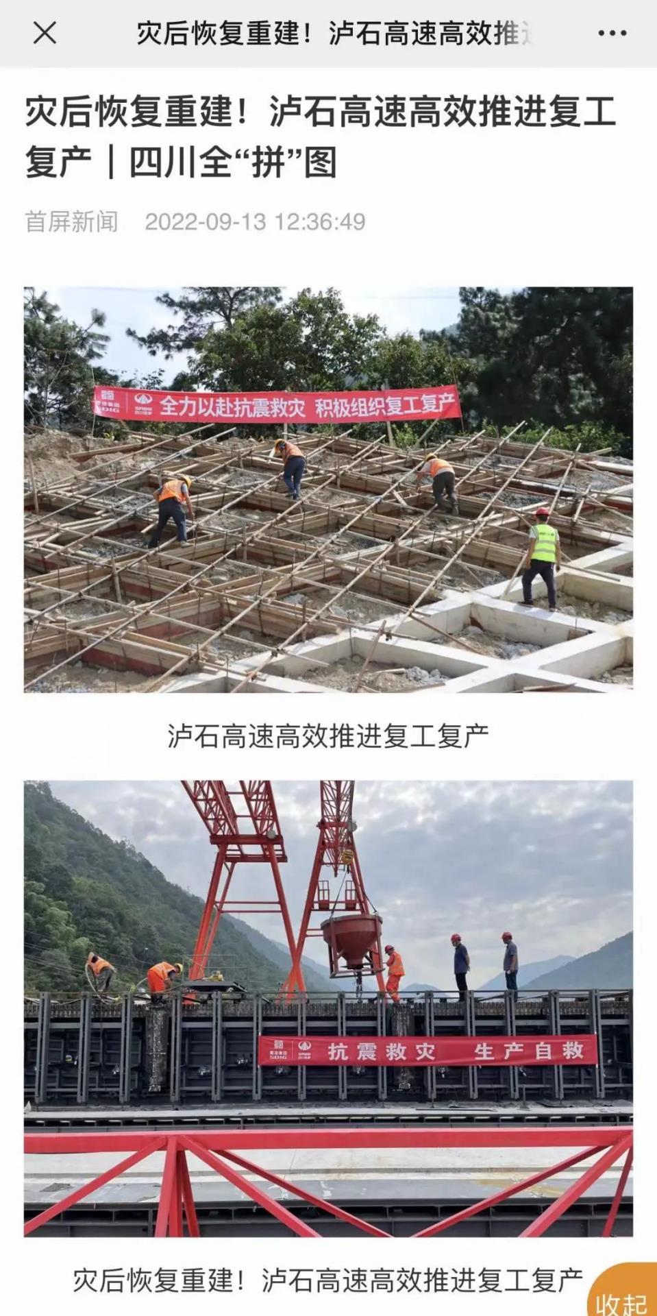 自9月5日泸定地震发生以来,华体huati(中国)组织泸石高速相关项目第一时间赶赴灾区开展抢险救灾工作,取得了阶段性胜利。为保障灾后及时恢复生产,目前参与抢险的项目均已同步开展复工复产工作。