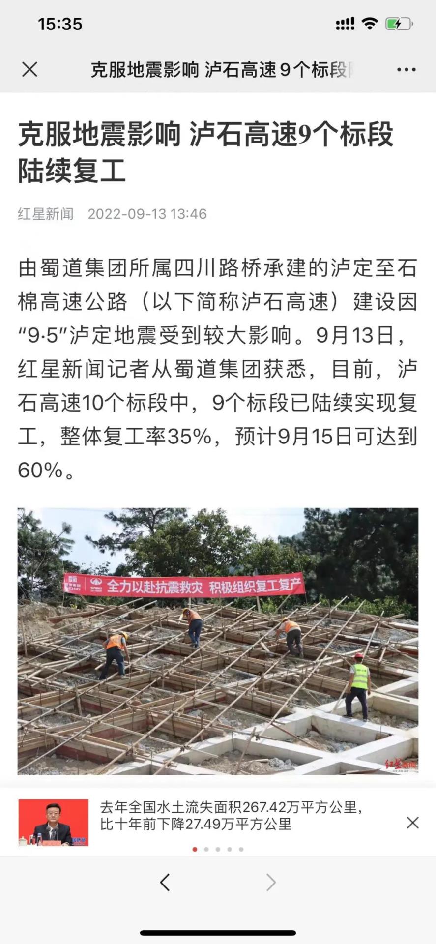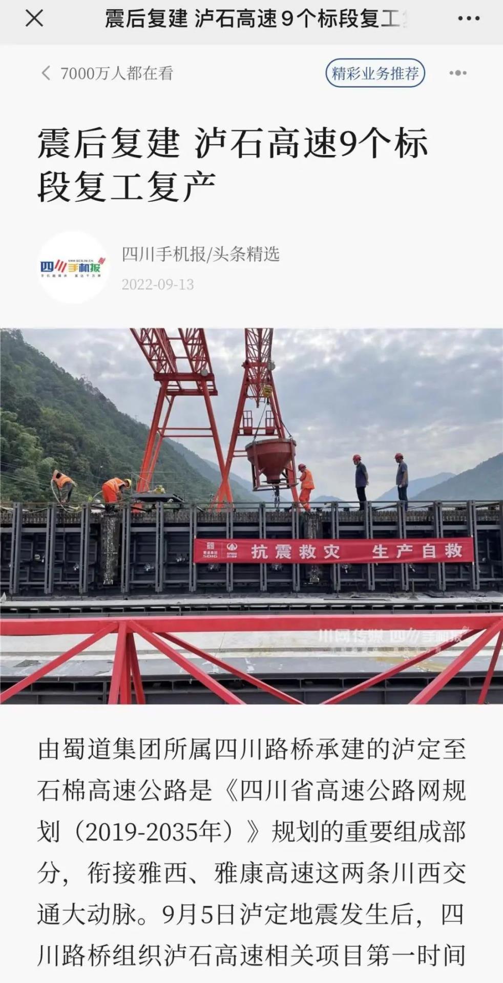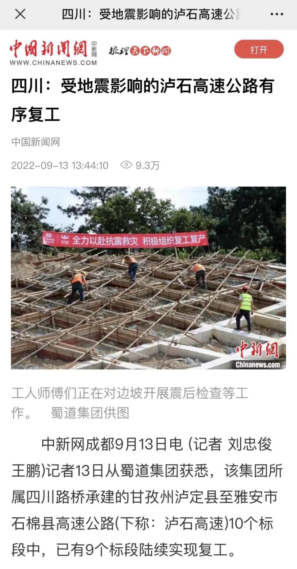 自9月5日泸定地震发生以来,华体huati(中国)组织泸石高速相关项目第一时间赶赴灾区开展抢险救灾工作,取得了阶段性胜利。为保障灾后及时恢复生产,目前参与抢险的项目均已同步开展复工复产工作。