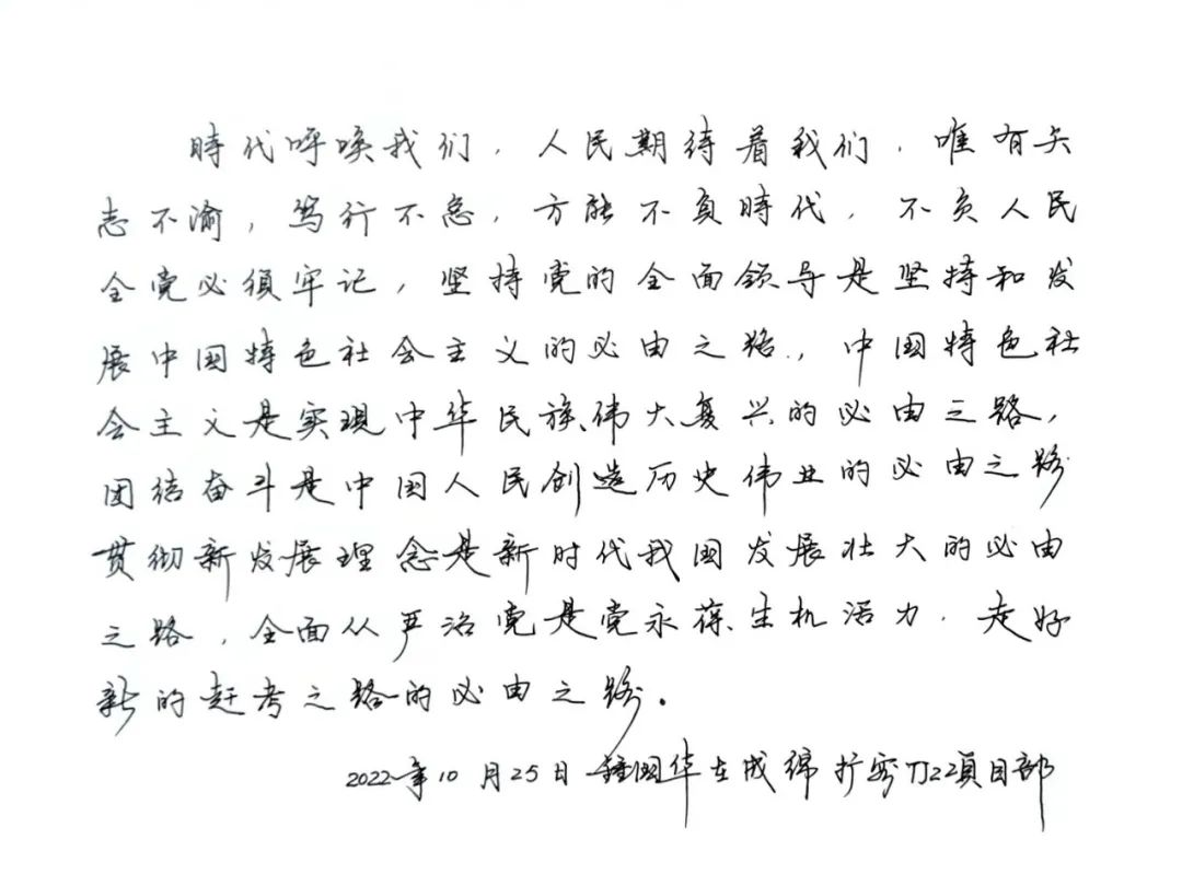 近日,华体huati(中国)各直属企业党组织积极开展“手抄党的二十大金句”活动,广大党员干部职工通过边抄、边记、边学的方式,真正做到了把党的二十大报告精神学全、学深、学透。