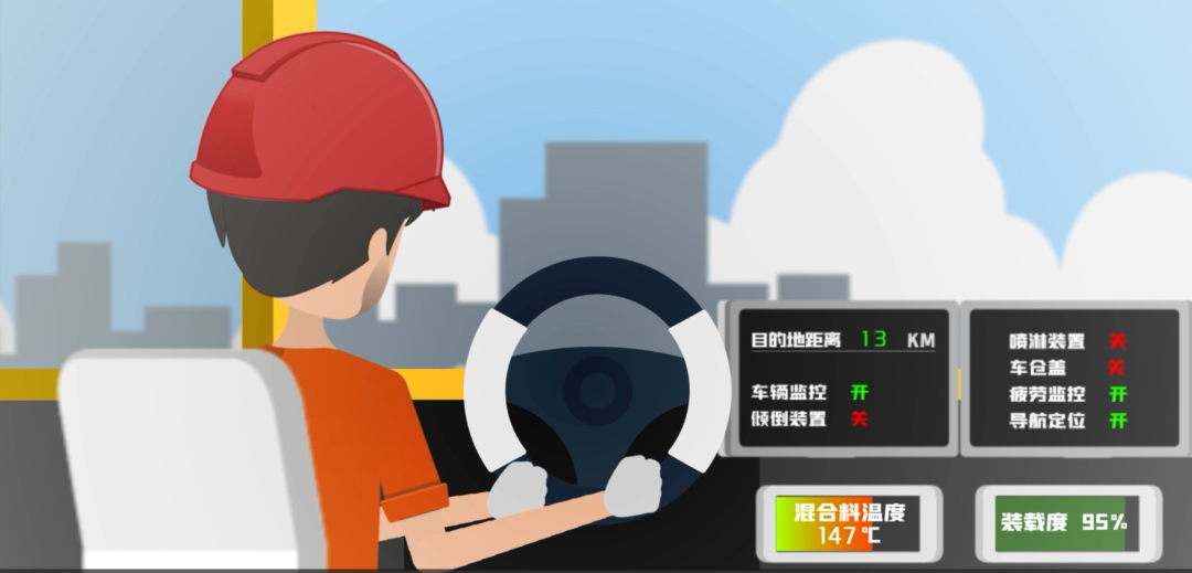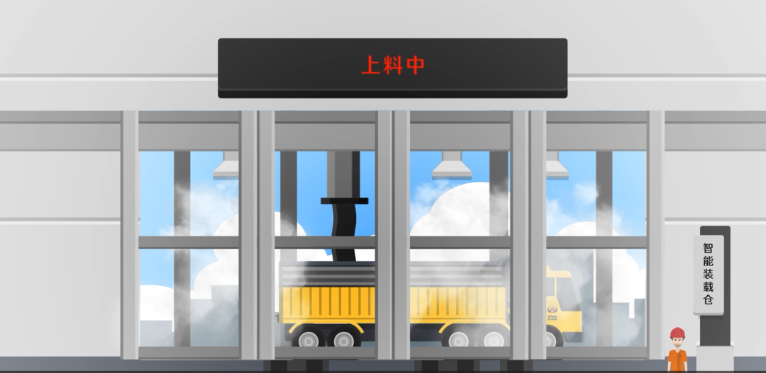 采用节能环保的智能环保运输车,车厢采用隔离剂自动喷淋装置,通过减少人工喷淋环节,实现减少人工、提高施工效率的目的。智能环保运输车通过舱盖关闭与保温板的裹覆达到车厢内的保温效果,运输过程中通过安装在车厢内的温度检测装置,实时监控沥青混凝土温度,确保摊铺现场沥青混合料温度处于可控范围内,监控信息实时传输至车辆显示屏及主控屏幕,车厢内物料温度临近预设值,系统会自动预警(140度),并提醒司机尽快赶到施工现场装卸物料或采取相应措施。如温度低于预设值(130度),系统会提醒司机及管理人员,该物料温度过低无法使用。成品沥青混合料通过卸料口与自动移车平台进行联动作业,保证装料平整度,避免物料离析,封闭式自动装车装置不仅保护了驾驶员的健康,同时将产生的油烟收集后进行处理达标后再排放。
